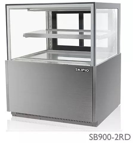 SkipioSkipio SB900-2RD - Two-Tier Rectangle Bakery Case Vertical Glass Cake Display Stainless Finish One shelves plus base Front heated glass Side glass...