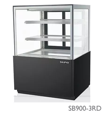 SkipioSkipio SB900-3RD - Three-Tier Bakery Display Case Vertical Glass Cake Display Stainless Finish Two shelves plus base Front heated glass Side glass...